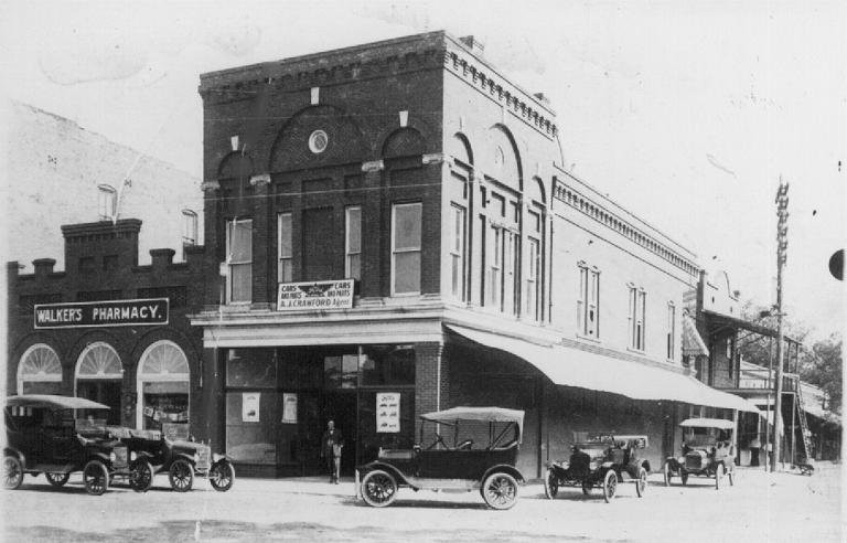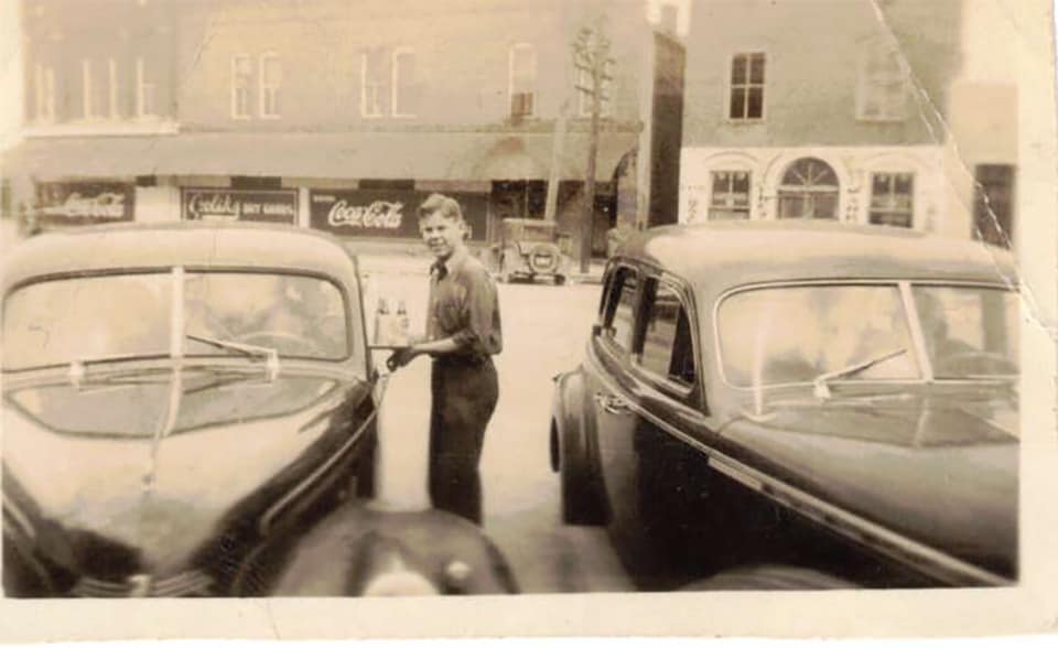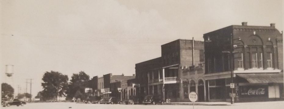 A young Don Whatley serving drinks out in front of Reynolds Pharmacy circa 1939-1940. The building in the background is the Souder Building (currently Knights Pharmacy) and the two story building just behind it was a butcher shop. The owner of the shop lived in the second story of the building. The building on the far right is the Reynolds Banking Co building (I believe the bank had gone out of business by this time. (Jamie Whitley