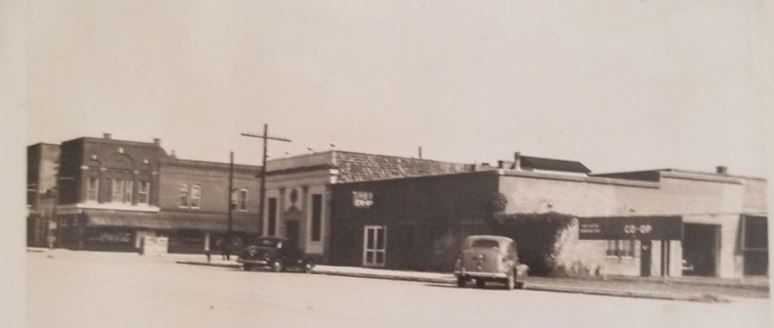 This photo was taken facing south sometime between 1909 and 1913. The first building on the left is the old First National Bank building (built in 1909) which is now Tim's Fireside Grill and directly across from it is the Souder Building which is now Knights Pharmacy. The second story wasn't added to the Souder Building until around 1912 when the Ford Dealership used the building. Notice the water tank in the middle of the intersection with the public well just below it.