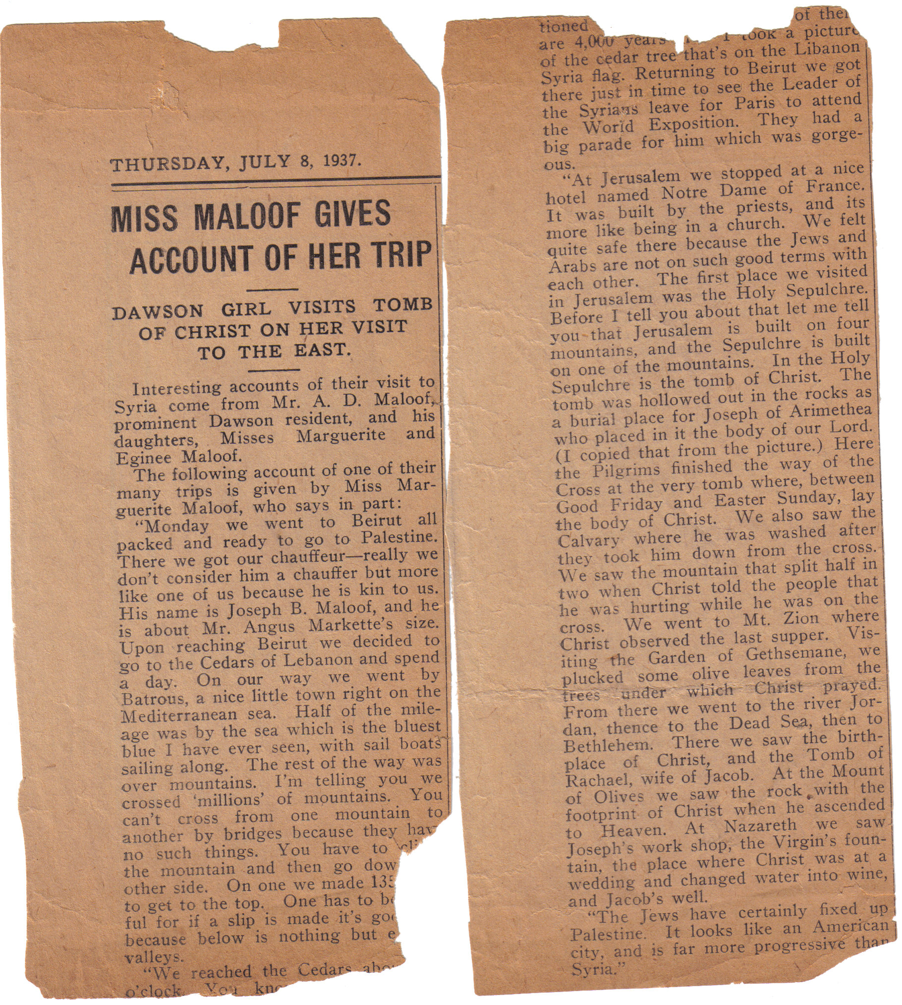 Newspaper clipping of the Maloof family trip to the Middle East.